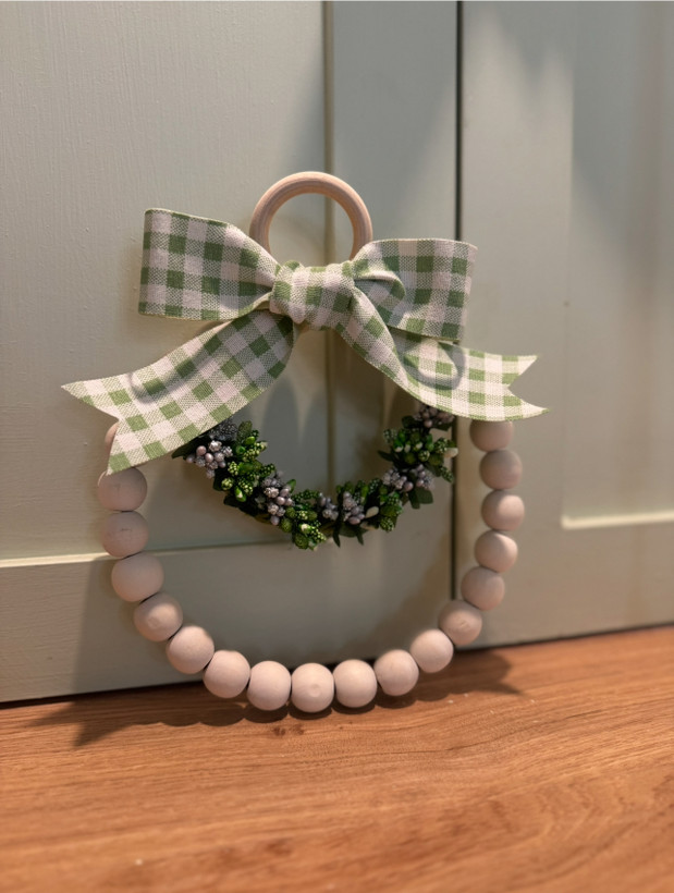 ترکیبی از سادگی و ظرافت، با مهرههای چوبی طبیعی و ربان چهارخونه که حس سادگی و صمیمیت را به فضا میبخشد. در مرکز آن، حلقهای از گلهای ظریف قرار دارد که جلوهای خاص و چشمگیر ایجاد میکند.