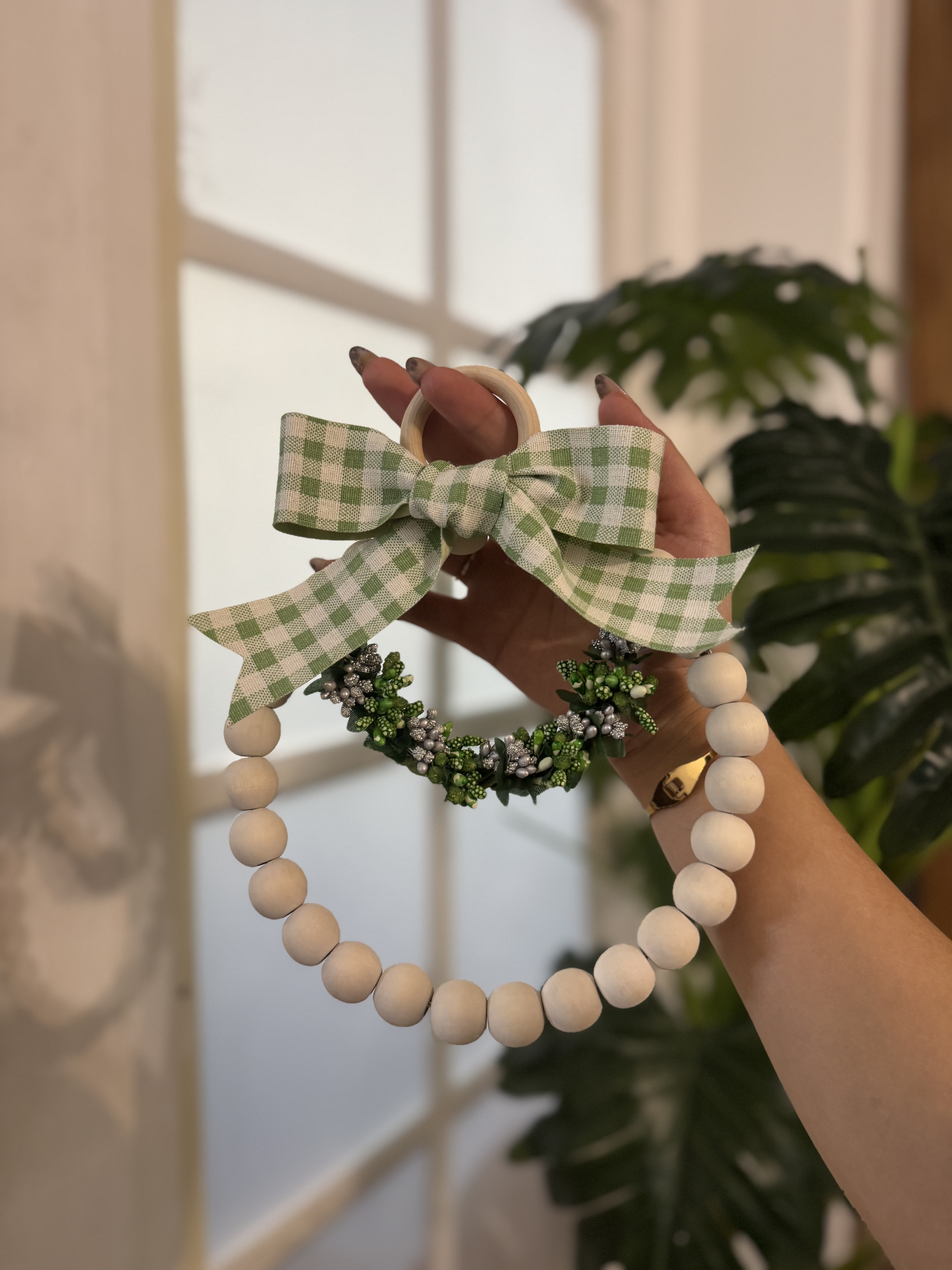 ترکیبی از سادگی و ظرافت، با مهرههای چوبی طبیعی و ربان چهارخونه که حس سادگی و صمیمیت را به فضا میبخشد. در مرکز آن، حلقهای از گلهای ظریف قرار دارد که جلوهای خاص و چشمگیر ایجاد میکند.