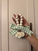 «ربان سبز چهارخانه» با ترکیب مهرههای چوبی طبیعی، گلهای مینیمال و ربان پارچهای با طرح چهارخانه سبز، یک اکسسوری دستساز و خاص برای جلوه دادن به دکور داخلی شماست.