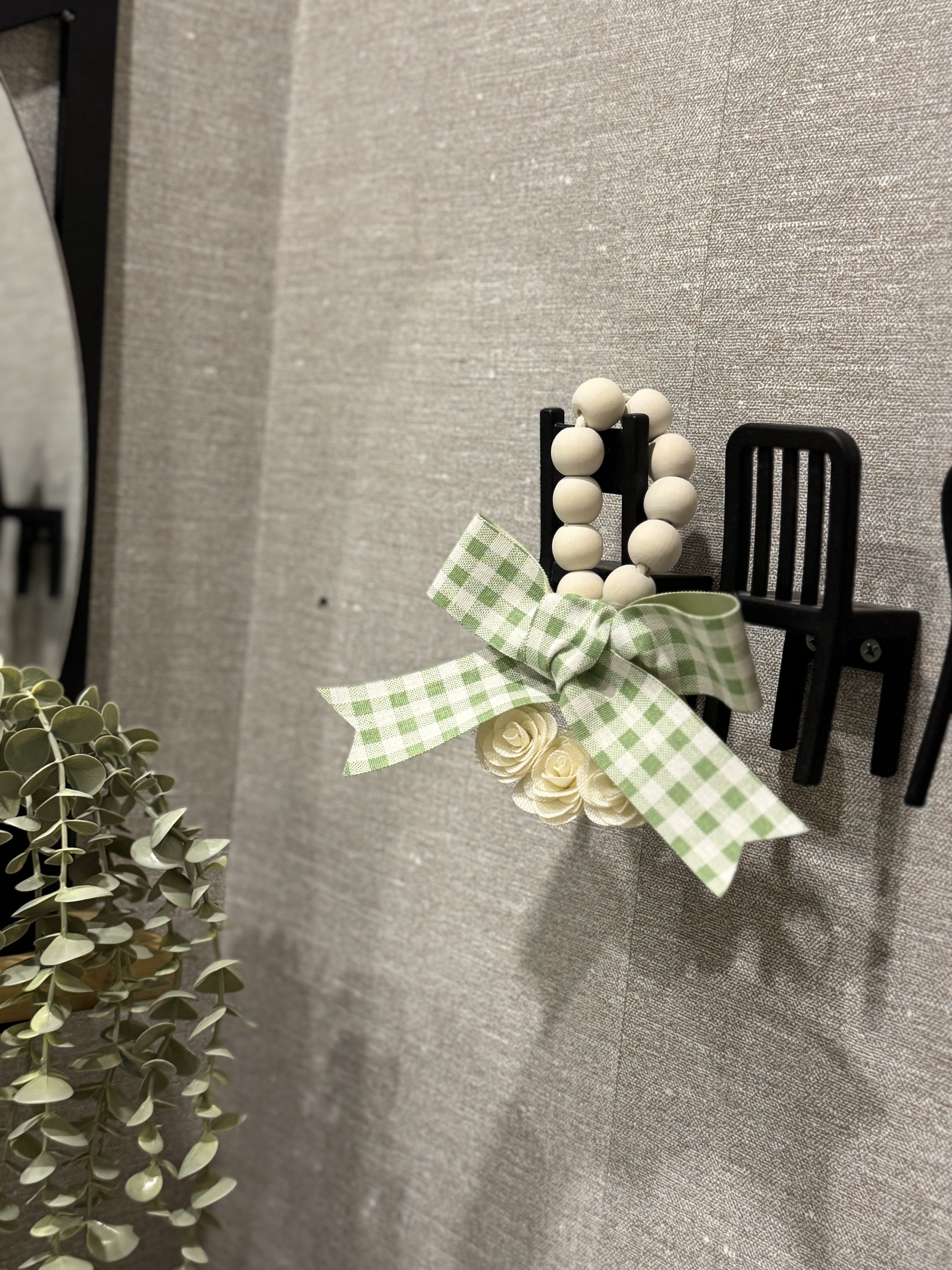 «ربان سبز چهارخانه» با ترکیب مهرههای چوبی طبیعی، گلهای مینیمال و ربان پارچهای با طرح چهارخانه سبز، یک اکسسوری دستساز و خاص برای جلوه دادن به دکور داخلی شماست.